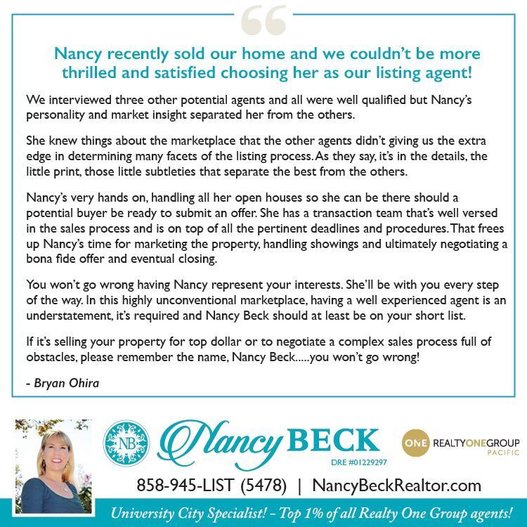 Nancy Beck has been successfully helping clients navigate buying and selling homes for over 20 years. She is in the Top 1% of all Realty ONE Group agents worldwide in Sales Production (last year she sold over $43,000,000)!!! She is the #1 selling agent in the University City/La Jolla Realty ONE Group Pacific office! She's received Centurion Awards, Double Centurion Awards, and GRAND Centurion 15 years in a row! Centurion Honor Society and President's Award recipient! Excellence in Client Service and Quality Service Awards recipient! Nancy Beck is: Genuine, Authentic, Smart, Energetic, Caring, a top-notch negotiator, and a University City Expert, she consistently goes Above and Beyond! Nancy Specializes in selling University City / UTC (92122) and also sells throughout San Diego. Nancy has an excellent reputation with her clients, the community, and her peers. Dedicated to the community she lives and works in she regularly sponsors University City major events such as Oktoberfest, Taste of the Triangle, UC 4th of July Celebration, schools, sports teams, music programs, etc. Nancy gives back to the community that supports her! Served on the Executive Board of the EdUCate! Foundation, which supports all 5 University City schools. Nancy Beck would love to help you, too!
